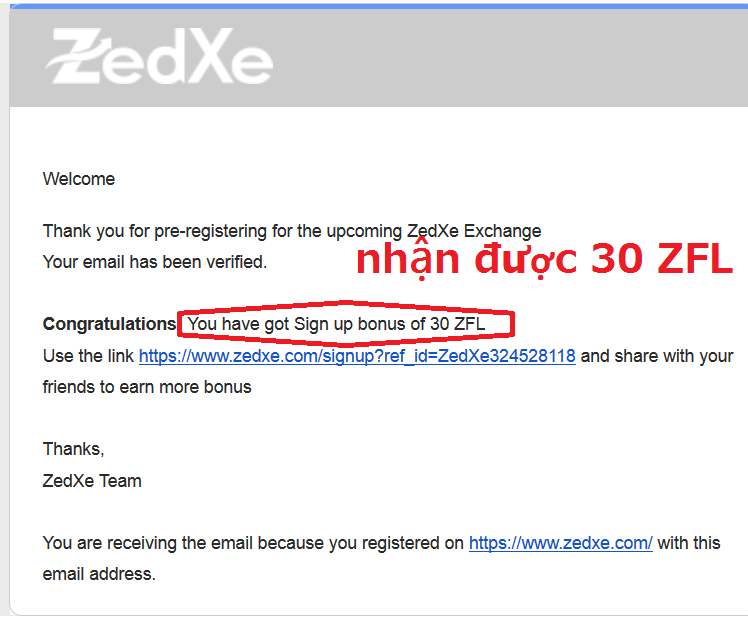 Bạn đã nhận được 30 ZFL coin như thông báo ở email: