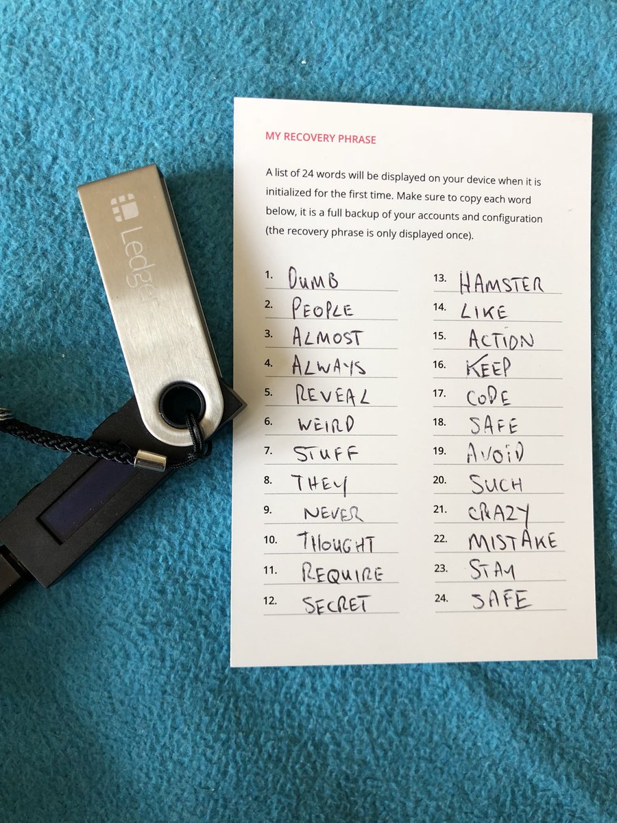 Trước khi sử dụng ví cứng bạn bắt buộc phải lưu trữ 24 từ khóa hạt giống (seeds), có 24 từ này bạn có thể khôi phục lại ví của mình bất cứ lúc nào, bạn nên viết nó cẩn thận ra 2 bản rồi lưu trữ ở 2 nơi thật an toàn. Hình ảnh minh họa: